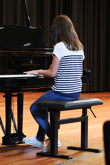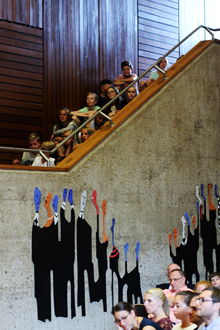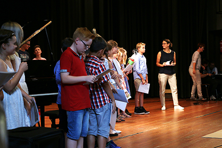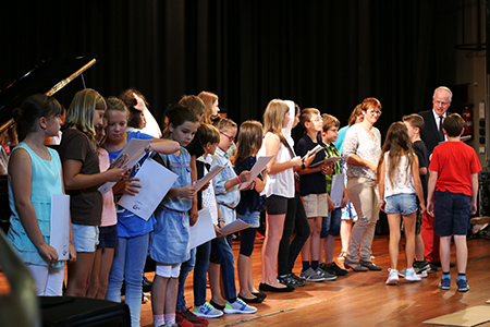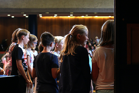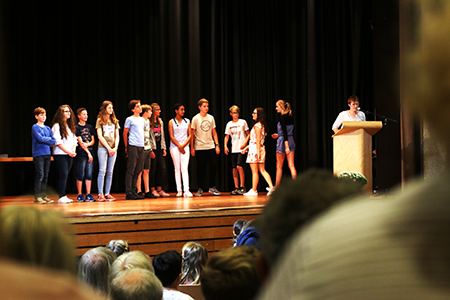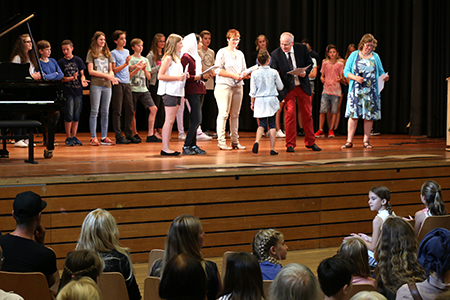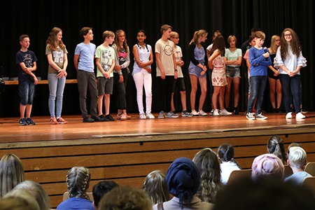 Dieses Jahr begann die Veranstaltung mit einem ökumenischen Einschulungsgottesdienst in St. Severin und setzte sich danach im PZ fort. Schulleiter Ulrich Güth begrüßte die neuen Schülerinnen und Schüler und betonte, dass es am Gymnasium neben dem Lernen auch um den Spaß und den Zusammenhalt gehe. Ein traditioneller Fritzchen-Witz schloss seine aufmunternde Rede ab, die Schülern und Eltern signalisierte, wie willkommen sie am Gymnasium sind. Auch Herr Kaiser, der die Begrüßungsrede der Klassenlehrer übernahm, betonte, dass die anfängliche Aufregung ganz normal sei und sicherlich bald vorbei gehe. Einen feierlichen, aber auch humorvollen Rahmen gab die Klasse 7a der Veranstaltung. Sie sorgte mit einem Boomwhacker-Musikstück unter der Leitung von Herrn Meiners und einem witzigen Theaterstück aus dem Schulalltag einer „ganz ruhigen Vorzeigeklasse“ unter der Leitung von Frau von Leoprechting für eine entspannte und heitere Atmosphäre. Erika Krawtschik, ebenfalls aus der 7a, zeigte am Klavier zum wiederholten Male ihr Können.